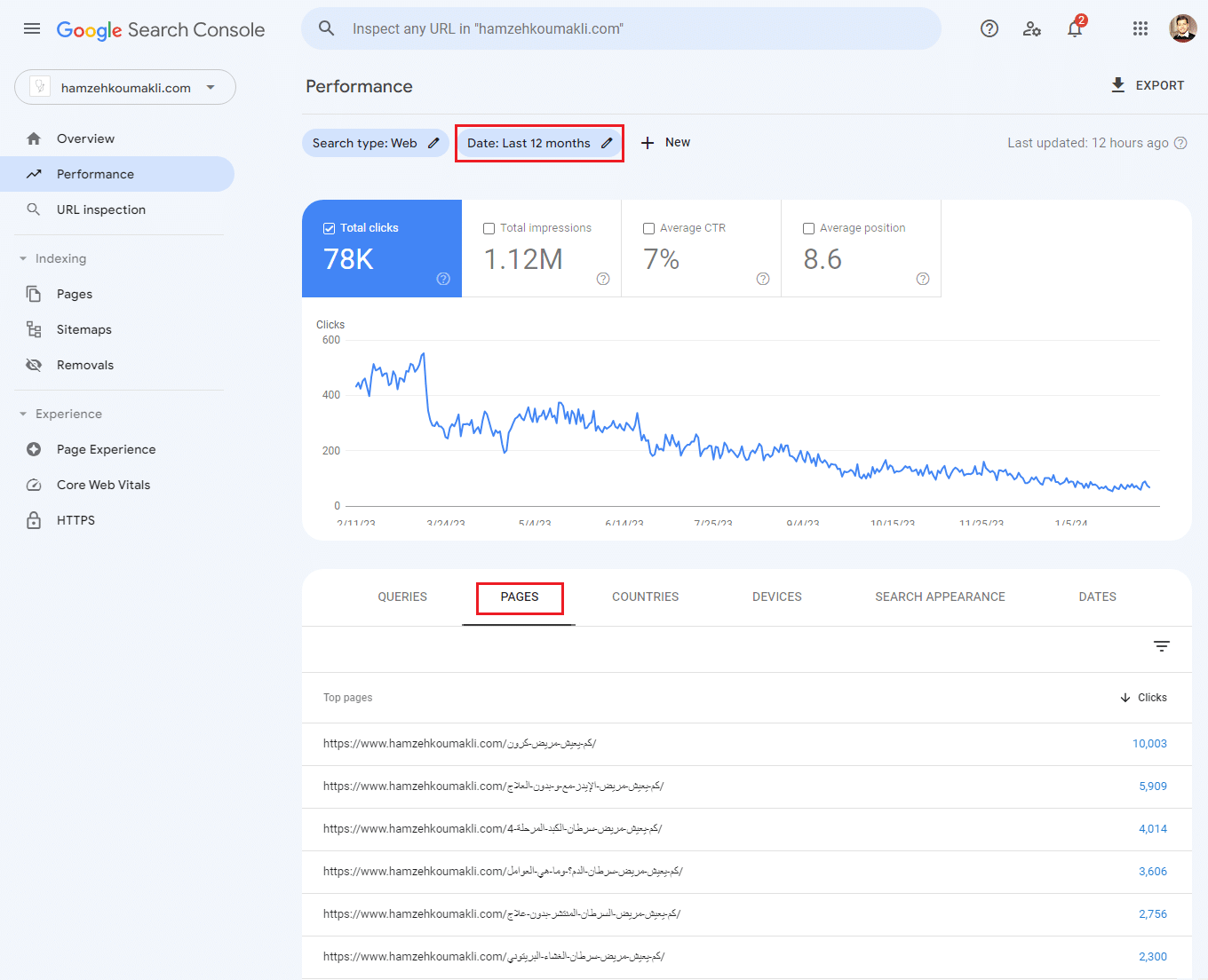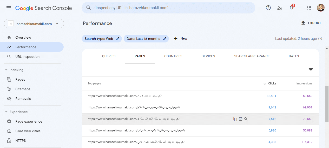 ابدأ أولاً بتحديد أهم الصفحات في موقعك، يمكنك ذلك في Google Search Console كما هو موضح في الصورة: