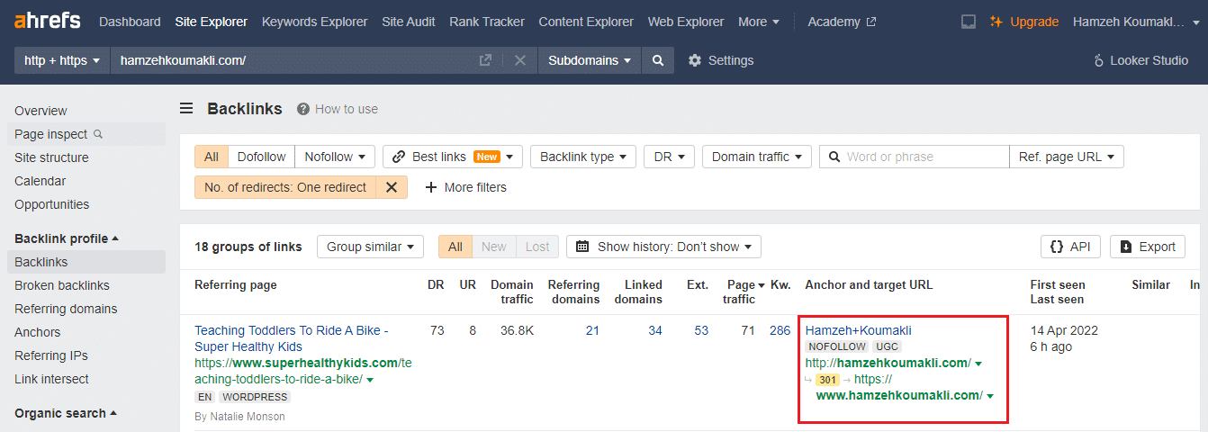 يمكنك العثور على هذه الصفحات من خلال أداة ahrefs حيث ستجد وسم 404 أو غيره قرب الصفحات المحذوفة التي تملك Backlink، لاحظ في الصورة التالية أن بعض الصفحات التي تملك Backlink معاد توجيهها من خلال Redirect 301: