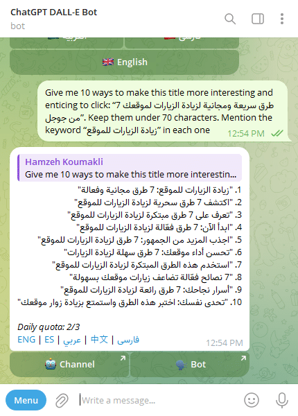 بعد اختيار مقالٍ معين يستهدف كلمة مفتاحية معينة ننصحك بالاستعانة بـChatGPT للحصول على نتائج سريعة، وذلك من خلال سؤاله عن كيفية بحث المستخدمين عن هذه الكلمة المفتاحية باستخدام لغة معينة غير العربية.